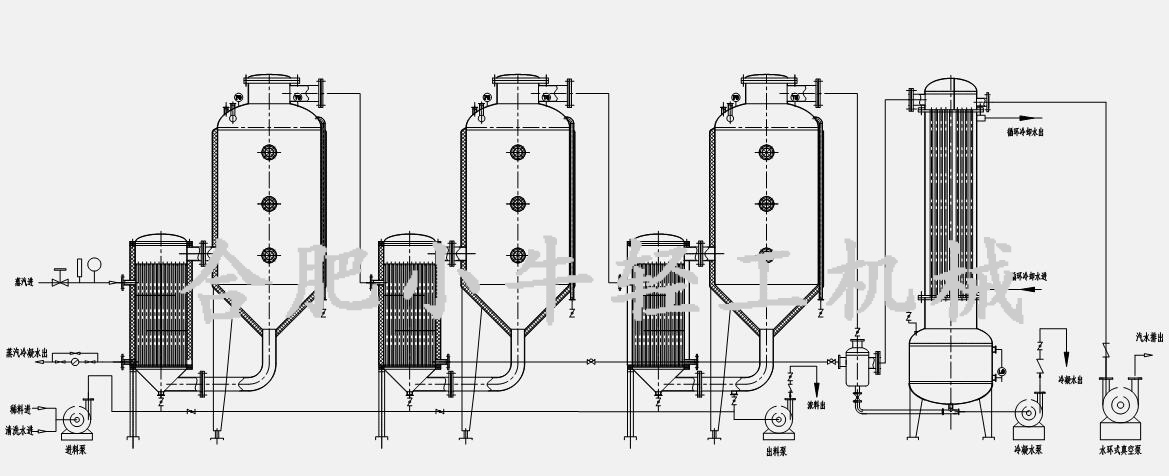 三效外循環(huán)蒸發(fā)器主要組成部件有第一效加熱器、第二效加熱器、第三效加熱器、第一效分離器、第二效分離器、第三效分離器、冷凝器、冷凝水罐、真空泵、料液泵、閥門管路系統(tǒng)、電控系統(tǒng)等。設(shè)備在運(yùn)行時,料液通過泵送或真空自吸原理進(jìn)入各效加熱器及各效分離器的管程,加熱介質(zhì)(鍋爐蒸汽)進(jìn)入第一效加熱器的殼程,料液在真空狀態(tài)下沸點(diǎn)降低,當(dāng)受熱到一定溫度后開始沸騰,并從噴射管噴入分離器,進(jìn)行快速蒸發(fā)和汽液分離,未被蒸發(fā)的料液從底部循環(huán)管回流到加熱器再次噴入分離器,形成循環(huán)。由一效加熱器產(chǎn)生的二次蒸汽進(jìn)入二效加熱器殼程,作為第二效加熱器的加熱介質(zhì),同理第二效的二次蒸汽作為第三效加熱器的加熱介質(zhì),熱能得到充分利用,從而實現(xiàn)節(jié)能效果。最后的蒸汽進(jìn)入冷凝器,被冷卻循環(huán)水換熱冷凝成液相,進(jìn)入冷凝水收集罐,最后排出。第二效、第三效的物料運(yùn)動狀態(tài)與第一效同理,當(dāng)料液縮到一定的程度,經(jīng)取樣確定合格后即可出料,完成蒸發(fā)濃縮過程。