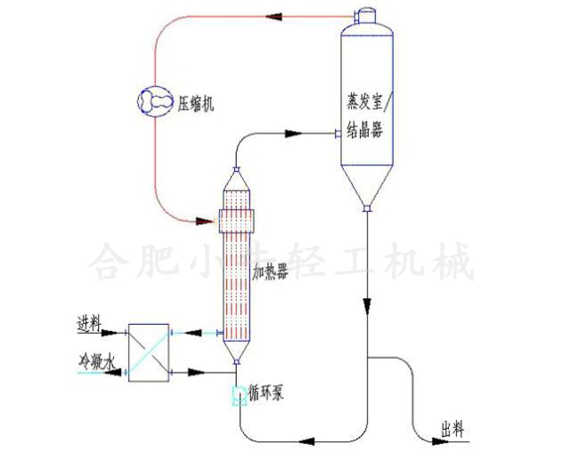 物料在加熱器的管程內被殼程的蒸汽加熱溫度升高,在循環(huán)泵作用下物料上升到分離器中,在分離器內由于物料靜壓下降使物料發(fā)生蒸發(fā)。蒸發(fā)產(chǎn)生二次蒸汽從物料中溢出,物料被濃縮產(chǎn)生過飽和而使結晶生長,解除過飽和的物料進入強制循環(huán)泵,在循環(huán)泵作用下進入加熱器,物料如此循環(huán)不斷蒸發(fā)濃縮或濃縮結晶。晶漿從循環(huán)管路中用出料泵輸出。蒸發(fā)分離器內的二次蒸汽經(jīng)過蒸發(fā)分離器上部的分離和除沫裝置凈化后輸送到壓縮機,壓縮機把二次蒸汽壓縮后輸送到加熱器殼程用作蒸發(fā)器加熱蒸汽,實現(xiàn)熱能循環(huán)連續(xù)蒸發(fā)。
